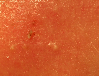 Ilustración 2 Fotografía tomada inmediatamente después de la extracción con láser de CO2 en donde se aprecia queratina y la micro-cápsula. No hay sangrado pues el plano es más superficial. |
