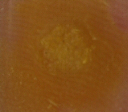 Ilustración 2 Aspecto posterior a dos tratamientos con ácido Nitrico al 28% y curetaje con hoja de bisturí buscando definir la parte afectada y remover porciones afectadas contaminadas. Se aprecia que se requiere conseguir una mayor profundidad para la extirpación completa. Una mayor cantidad de citas puede conseguir el objetivo pero se decidió utilizar el láser de Erbio-YAG para retirar la parte queratósica. |