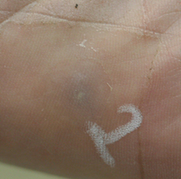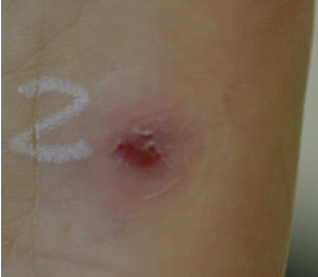 Ilustración 3 Aspecto 6 días posterior a la sesión con láser Erbio-YAG. Con el láser se llegó hasta la porción dérmica preservándola y comprobando que la lesión era superficial. Se ampliaron márgenes de 2 mm desde el área afectada inicial |