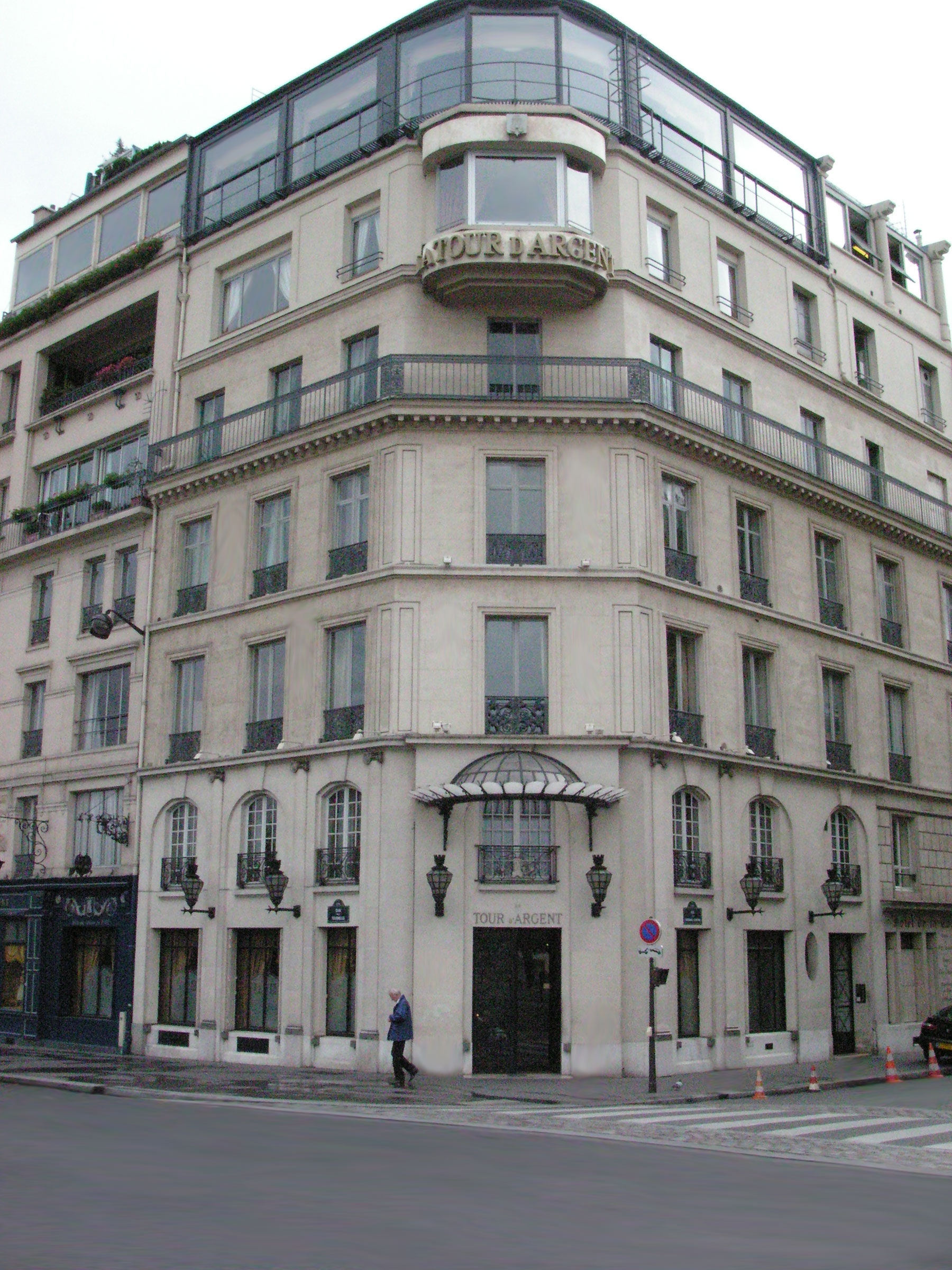 La Tour D'Argent es el restaurante más famoso del mundo, y también uno de los más antiguos, ya que fue fundado en 1.582. Está situado en el 15-17, Quai de la Tournelle, en el arrondissement 5 de Paris, en un estilo renacentista elegante por encima de todo. La Tour D'Argent tiene una cava de más de 450.000 botellas en servicio, con una carta de vinos que tiene 400 páginas. Se estima que la sola cava vale bastante más de 25 millones de Euros. Uno de los platos más solicitados en La Tour D'Argent es el Caneton Tour d'Argent. El restaurante tiene su propia granja en la que cría sus patos. Los comensales que ordenan el pato, reciben un certificado con el número serial de este, que ya hoy en día es una cifra en millones. La Tour D'Argent actualmente pertenece y es manejado por la familia Terrail. André Terrail, el propietario y gerente, es quien se hizo cargo en 2003, tres años antes de la muerte de su padre Claude, quien murió en 2006, a los 88 años. A su vez, Claude Terrail había manejado el restaurante que había heredado de su padre André en 1947. Durante los últimos años, ha caído de su posición de «3 estrellas» para los mejores restaurantes (el máximo posible en la Guía Michelín), a 2 estrellas en 1996 y de forma sorprendente, finalmente a una modesta estrella en 2006. La Tour D'Argent conserva sin embargo todo su glamour, toda su elegancia y su famosa cava, pero no permite que se diga de él, que es uno de los restaurantes del mundo donde mejor se come. |