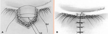 Esquema del corte y cierre en la resección de lunares en los párpados |