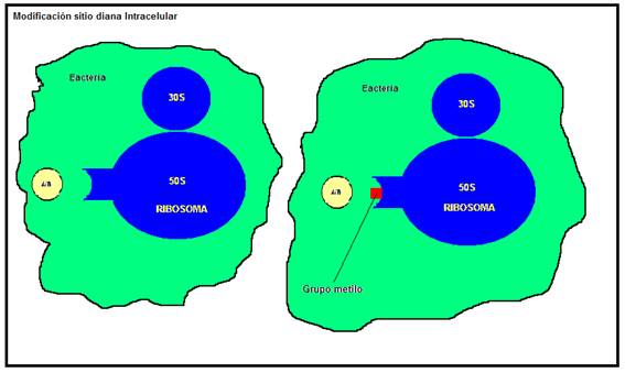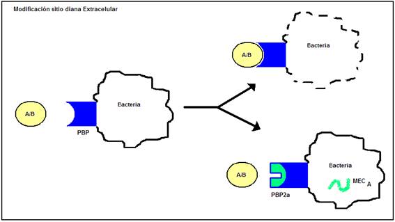 La modificación del sitio diana puede ser extracelular como ocurre con la resistencia del S. aureus y S. pneumoniae, que se da por modificación de la enzima blanco en la pared bacteriana, mediante la presencia de un gen Mec A, que codifica una PBP modificada la PBP2a, para la cual no tienen afinidad los ß lactamicos. Esta estrategia de disminución de afinidad por las PBP, también la presentan el H. infuenzae y la N. meningitidis.