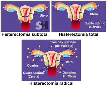 Tipos: La histerectomía presenta variantes dependiendo de la manera como se realice. Ninguno de estos tipos incluye la extracción de los ovarios o las trompas de Falopio, este procedimiento (salpingo-oforectomia) tiene otras indicaciones propias.| |