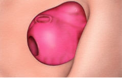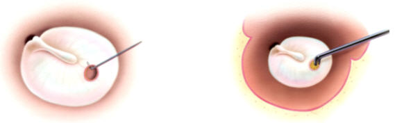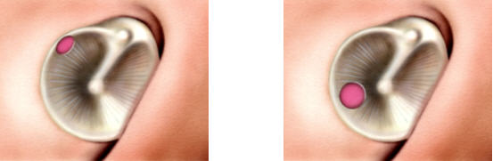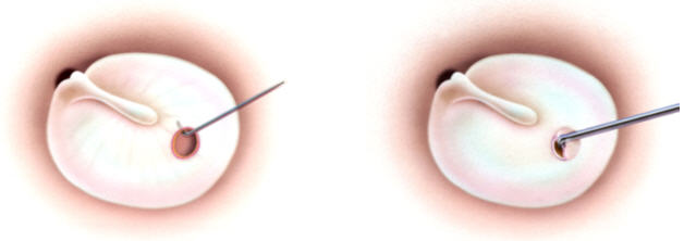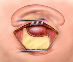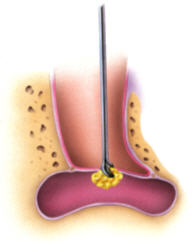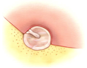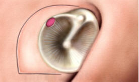 Existe una segunda alternativa utilizando grasa que se puede obtener del lóbulo de la oreja. De igual manera que en la primera opción se requiere reavivar los bordes de la perforación (fig. 17) y colocar la grasa a través de ésta (fig. 18 y 19).
