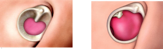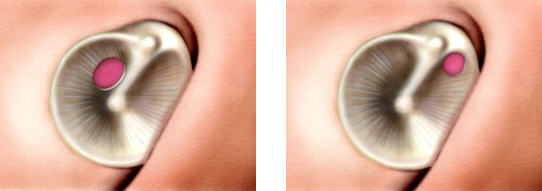 TÉCNICA TRANSPERFORACIÓNSe trata de un procedimiento que en la gran mayoría de los casos se hace por vía transcanal. Se utiliza para perforaciones pequeñas y centrales, hasta de un 20% en las que se puedan observar los bordes en su totalidad. Consiste en reavivar los bordes de la perforación, taponar el oído medio con esponja absorvible y colocar el injerto a través de la perforación, terminado con un empaquetamiento del conducto auditivo externo (5).Su uso es muy limitado. La gran ventaja radica en que se trata de un procedimiento sencillo, que se puede realizar con anestesia local, no requiere canaloplastia y se puede utilizar fascia o grasa. En algunos casos se lleva a cabo en el consultorio. TIPOS DE PERFORACIÓN Las gráficas siguientes muestran los tipos de perforaciones ideales para realizar este tipo de técnica quirúrgica (figura 13 y 14).