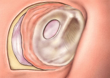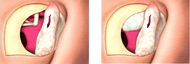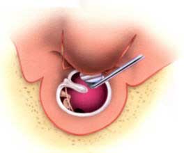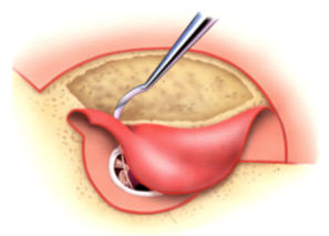 Figura 29 En esta técnica la cadena osicular no es movilizada ni tocada durante el procedimiento. El injerto se posiciona por debajo de los restos timpánicos; obliterando la cavidad del oído medio con esponja absorvible con el fin de evitar el hundimiento de la fascia.(Fig.30 y 31). Es vital la visualización de todos los bordes de la perforación con el fin de lograr una adecuada ubicación el injerto. Una vez taponada la cavidad, se recoloca el colgajo timpanomeatal y se procede al reposicionamiento de la franja vascular. La cirugía concluye con el cierre por planos de la incisión. (Fig. 32 y 33).