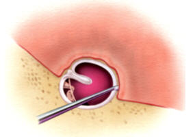 TÉCNICA QUIRÚRGICA Se deben reavivar los bordes de la perforación con un gancho o con láser (fig. 15) y posteriormente se coloca fascia a través de la perforación (fig. 16) previo taponamiento del oído medio con esponja absorvible.