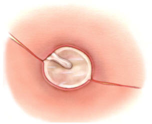 Reposición de la piel anterior: Bien sea el colgajo libre o pediculado de piel se debe reposicionar teniendo precaución que quede pisando el injerto de fascia, con el fin de preservar el ángulo anterior. Es importante la colocación de los fragmentos de empaquetamiento ya que estos nos ayudan a mantener la fascia y la piel en posición. La reposición de la franja vascular completa el procedimiento (fig. 26)