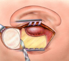 TÉCNICA QUIRÚRGICA. Las incisiones transmeatales se realizan a lo largo de la sutura timpanomastoidea y timpanoescamosa, demarcando la franja vascular. La cual se define como el área de piel que cubre la porción posterior y superior del conducto auditivo externo. La piel anterior es elevada en sentido lateral con un bisturí de Rosen teniendo precaución de realizar una adecuada desepitelización de los restos timpánicos (fig. 23).