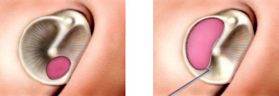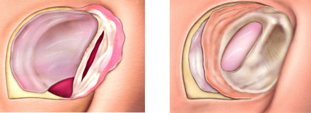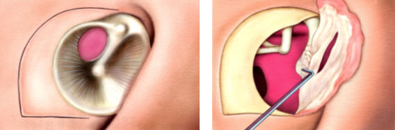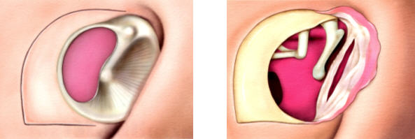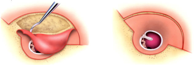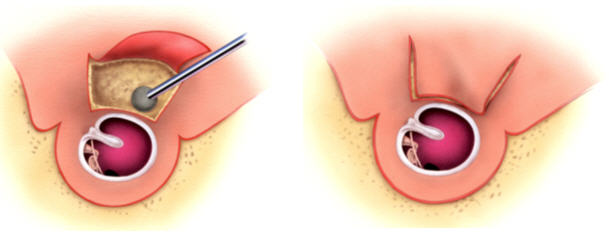 Remoción de la piel del CAE: Con el fin de exponer el conducto auditivo externo óseo y poder realizar la canaloplastia, se debe realizar el retiro de la piel de la pared anterior, para lo cual se pueden utilizar 2 técnicas: la primera realizando una incisión semilunar a nivel de la unión del conducto óseo y cartilaginoso, disecando la piel anterior hasta el anulus y retirándola en su totalidad hasta obtener un colgajo libre de piel. Una vez concluida la canaloplastia se reposiciona nuevamente el colgajo de piel. La Segunda forma consiste en realizar una disección de la piel anterior de medial a lateral elevándola desde el anulus hasta el meato y dejando un colgajo pediculado de piel en sentido lateral. De igual forma que en la técnica anterior se reposiciona una vez concluida la canaloplastia.(fig.24). En perforaciones pequeñas o cuando no se considere importante la canaloplastia, la elevación de los colgajos se puede limitar a una colgajo epitelial o la simple desepitelización de los restos timpánicos.