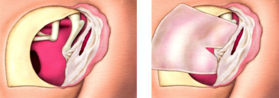 TÉCNICA POR ENCIMA. El injerto descansa por encima del remanente timpánico anterior y posterior y por debajo del mango del martillo. La técnica lateral o técnica por encima involucra 8 pasos bien definidos: incisiones transmeatales y elevación de la franja vascular; incisión retroauricular y extracción de la fascia; retiro de la piel del conducto auditivo externo; fresado y ampliación del conducto auditivo externo; desepitelización de los restos timpánicos; Colocación de la fascia por debajo del mango del martillo; recolocación de la piel del conducto y por último cierre de la incisión retroauricular y recolocación de la franja vascular. TIPOS DE PERFORACIONES . Se utiliza para perforaciones grandes con o sin remanente anterior o anulus fibroso. (Fig. 20, 21 y 22).