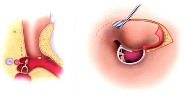 TÉCNICA QUIRÚRGICA ALTERNATIVA UNO La técnica se inicia con un abordaje retroauricular y extracción del injerto de fascia. Se eleva un colgajo timpanomeatal similar a la técnica por debajo. El mango del martillo es liberado del resto timpánico parcialmente. La canaloplastia esta indicada en casos en los que no se logra visualizar adecuadamente el anulus anterior y se realiza en forma similar a las técnicas antes descritas, sin modificar el ángulo anterior. El injerto es colocado medial al resto timpánico y lateral al mango del martillo. El taponamiento del oído medio solo se hace en la parte más anterior con el fin de dar un buen soporte al injerto. (Fig. 38 a 42).